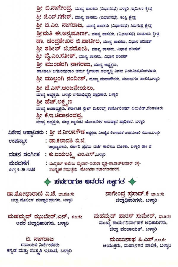 ಬಳ್ಳಾರಿ ನಗರ ಶಾಸಕ ನಾರಾ ಭರತ್ ರೆಡ್ಡಿ ಅವರು ಅಧ್ಯಕ್ಷತೆ ವಹಿಸುವರು.