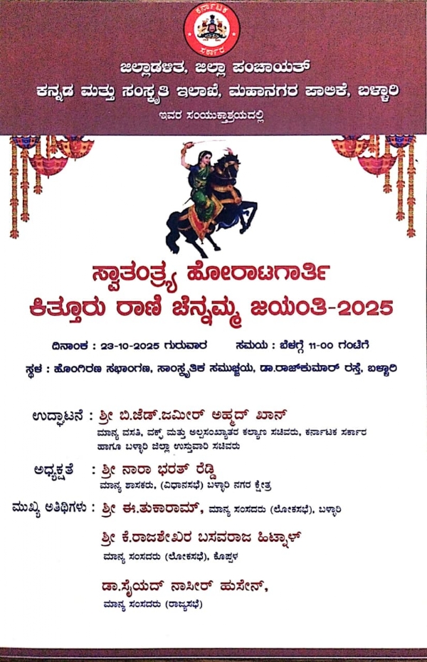 ಆ್ಯಂಕರ್ : ಜಿಲ್ಲಾಡಳಿತ, ಜಿಲ್ಲಾ ಪಂಚಾಯತ್, ಕನ್ನಡ ಮತ್ತು ಸಂಸ್ಕೃತಿ ಇಲಾಖೆ ಹಾಗೂ ಮಹಾನಗರ ಪಾಲಿಕೆ ಇವರ ಸಂಯುಕ್ತಾಶ್ರಯದಲ್ಲಿ ಸ್ವಾತಂತ್ರ ಹೋರಾಟಗಾರ್ತಿ ಕಿತ್ತೂರು ರಾಣಿ ಚೆನ್ನಮ್ಮ ಜಯಂತಿ ಕಾರ್ಯಕ್ರಮವನ್ನು ಅ.23 ರಂದು ಬೆಳಿಗ್ಗೆ 11 ಗಂಟೆಗೆ ನಗರದ ಡಾ. ರಾಜ್ಕುಮಾರ್ ರಸ್ತೆಯ ಸಾಂಸ್ಕೃತಿಕ ಸಮುಚ್ಚಯದ ಹೊಂಗಿರಣ ಸಭಾಂಗಣದಲ್ಲಿ ಏರ್ಪಡಿಸಲಾಗಿದೆ.